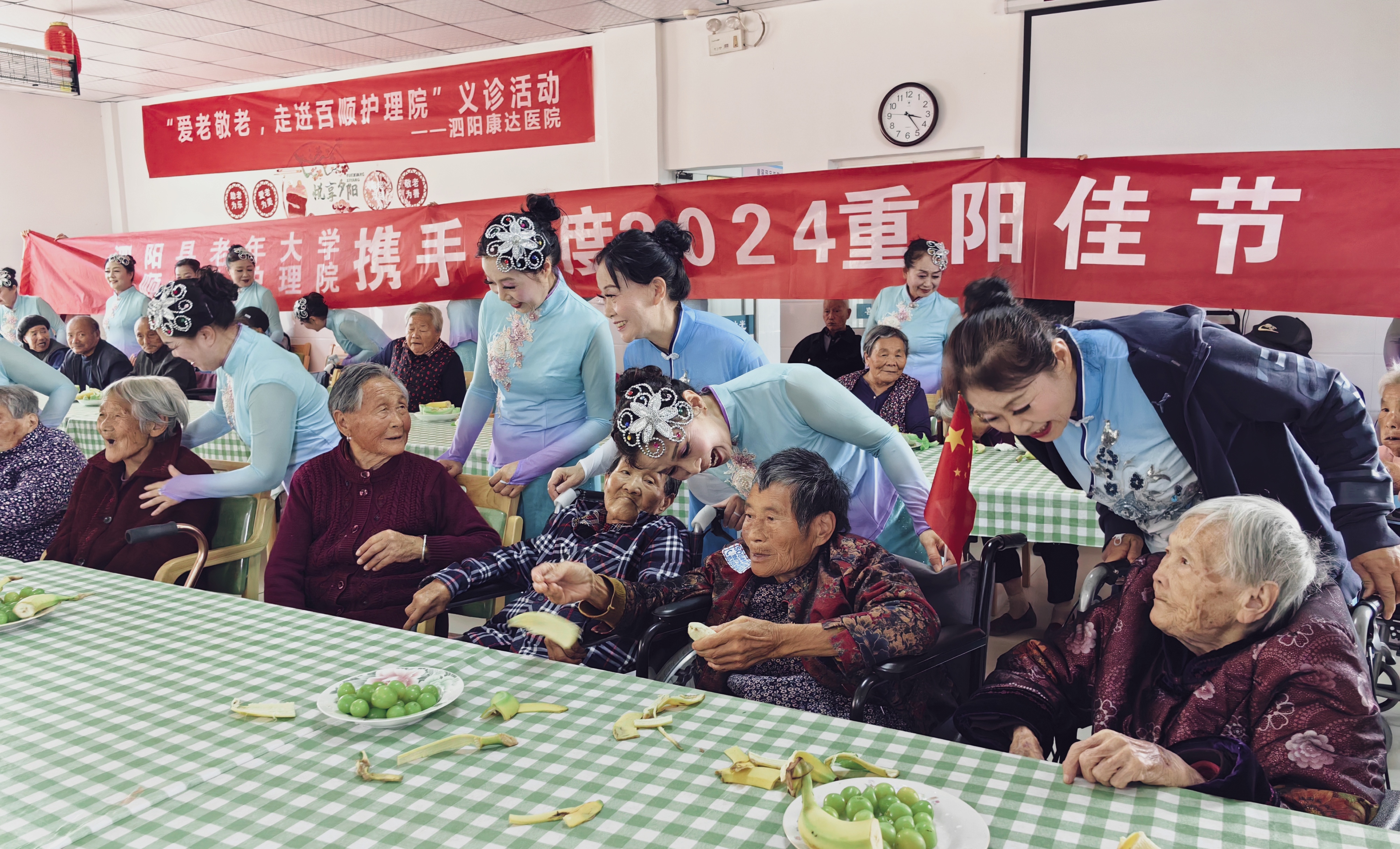 2024年10月11日,值重阳节之际,泗阳县老年大学艺术团走进桃果园百顺老人护理院,为这里的老人们带来了一场精彩纷呈的慰问演出,共同度过了一个温馨、欢乐的重阳佳节。