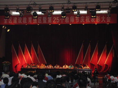 9月10日,鹤城区建设教育强区暨第25个教师节庆祝表彰大会在鹤城区行政中心隆重召开。此次会议是建区以来规模最大、规格最高的一次教育工作会议,也是区委、区政府深入学习实践科学发展观,贯彻落实教育强省、教育强市会议精神的重要举措。市委常委、区委书记谌贻章,区长邓小建,区委副书记印宇鹰,区人大常委会主任黄远华,区政协主席周有庚,市教育局副局长王争鸣,在家的区委常委及联系教育工作的副职,各街道办事处工委书记,区直副科以上行政事业单位行政一把手,区直各学校(幼儿园)校务会成员、民办学校校长、民办幼儿园园长,受表彰的省、市、区级优秀教师、优秀教育工作者、优秀班主任、师德标兵,离退休教师代表,区教育局机关副股室长以上干部共500余人参加了会议。
