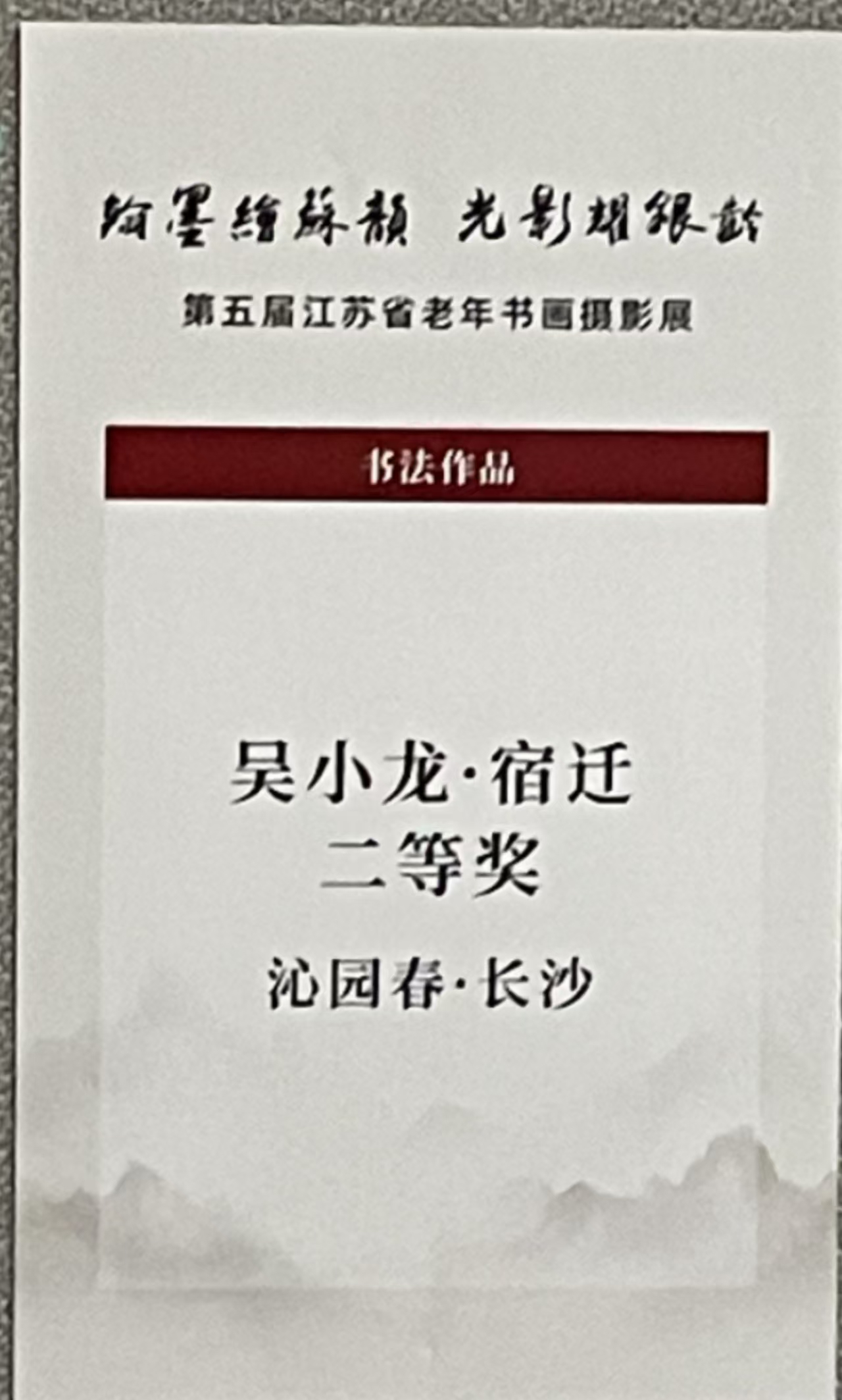 近日,在第五届江苏省老年书画摄影展上,我校教师吴小龙荣获书法二等奖。此次展览,书法一等奖仅3人,二等奖5人,吴小龙作为受邀参加本次书画展开幕式的获奖嘉宾。同时,我校书法班学员颜士国在此次展览中获得书法优秀奖。据悉,此次参展宿迁市仅3人获奖,我校独占2个,成绩斐然,充分展示我校在书法教学方面的卓越成果和教师学员的深厚艺术功底。